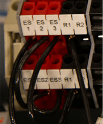 Now, terminate the 2 wires from the reset button to the black terminal marked R2. The red terminal ES1 and the black terminal R1 are used for the shutdown/reset buttons on the front door of the PowerPanelä.